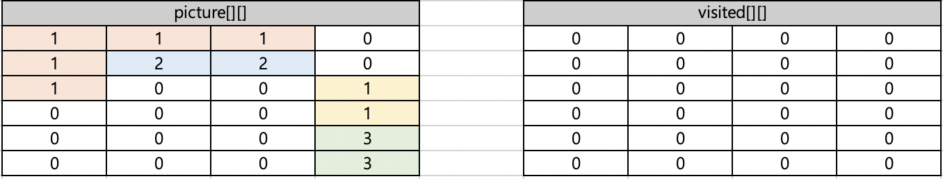 예제를 살펴보면 먼저 컬러링 북의 영역을 나타내는 이차원 배열을 만들고 값을 저장합니다. 또한 해당 칸을 방문한 적이 있는지 확인하는 배열을 만들고 0으로 초기화 합니다.