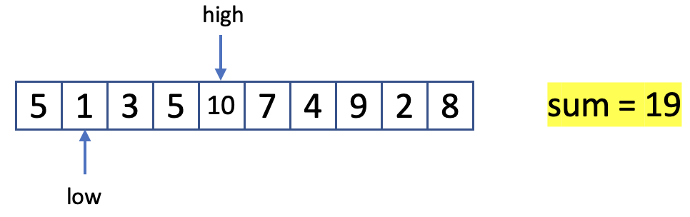 그래서 이 문제를 low, high 두개의 인덱스 값을 포인트로 두어 두 값을 이동시키는 방식으로 해결하였습니다.