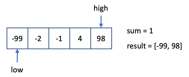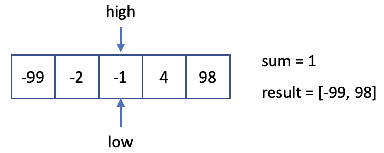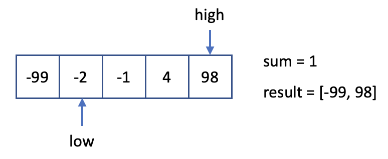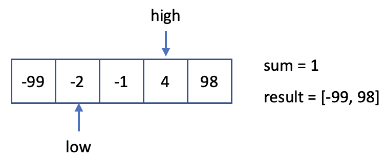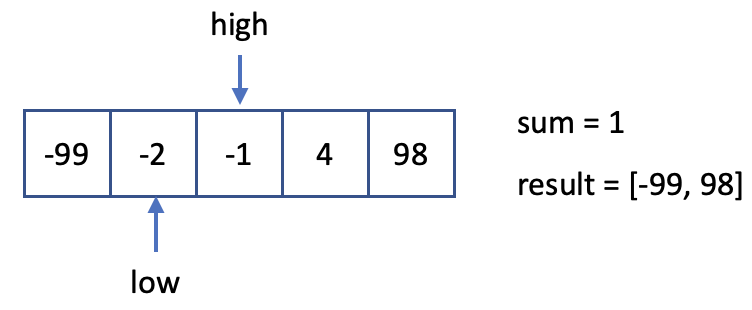 만약, low가 가리키는 값과 high가 가리키는 값의 합이 음수인 경우에는, high가 가리키는 값을 줄인다고 해도 결국 더 작은 음수가 나오기 때문에 low를 하나 증가시킵니다.