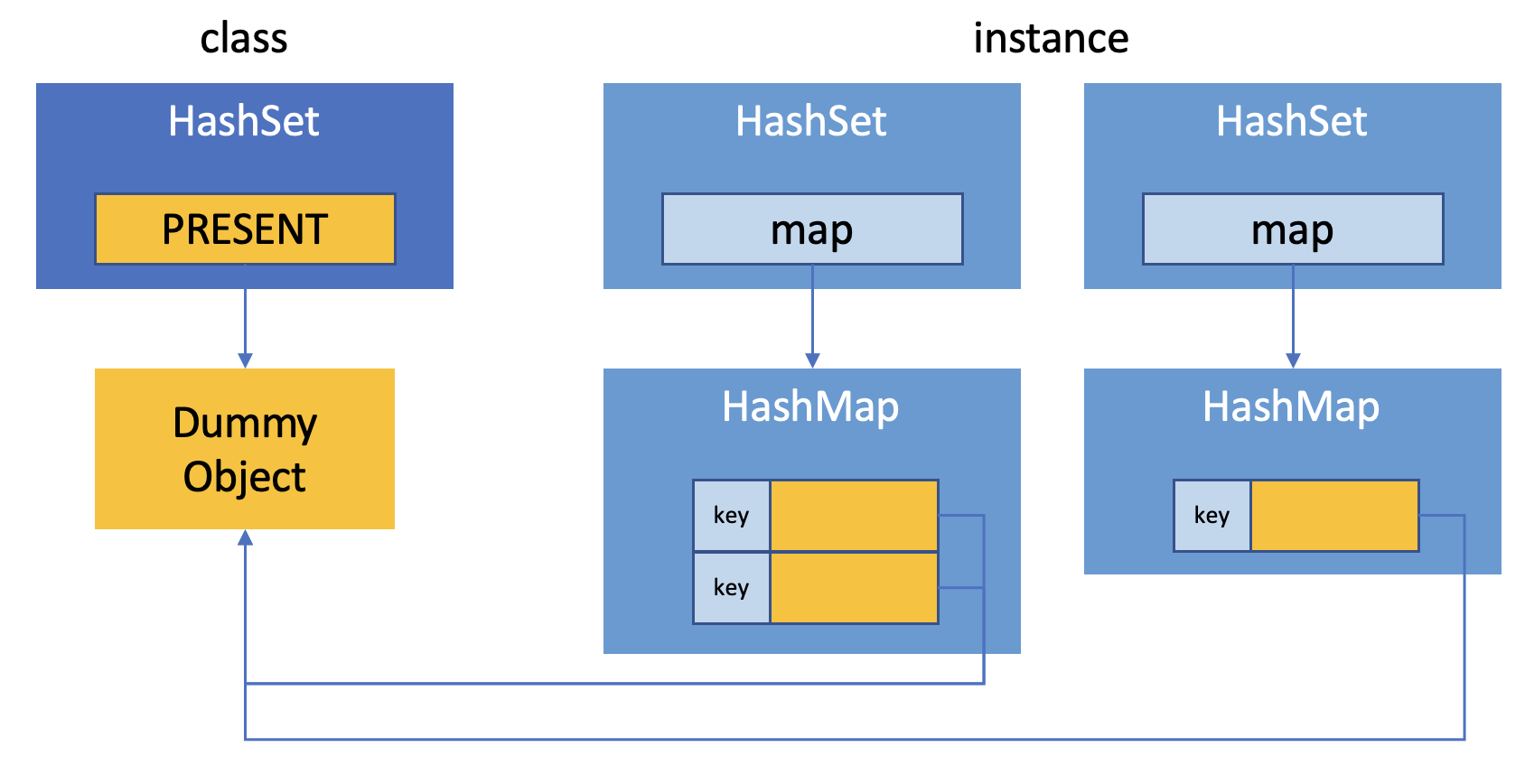Set은 중복이 없이 데이터를 저장하는 자료구조로 객체 형태의 key 값만 받아서 내부적으로는 HashMap 구조로 데이터를 저장합니다. HashMap으로 데이터를 저장할 때 주어진 key말고 value가 필요한데 이때 PRESENT라는 더미 오브젝트가 저장됩니다. 내부 구조를 그림으로 살펴보면 다음과 같습니다.