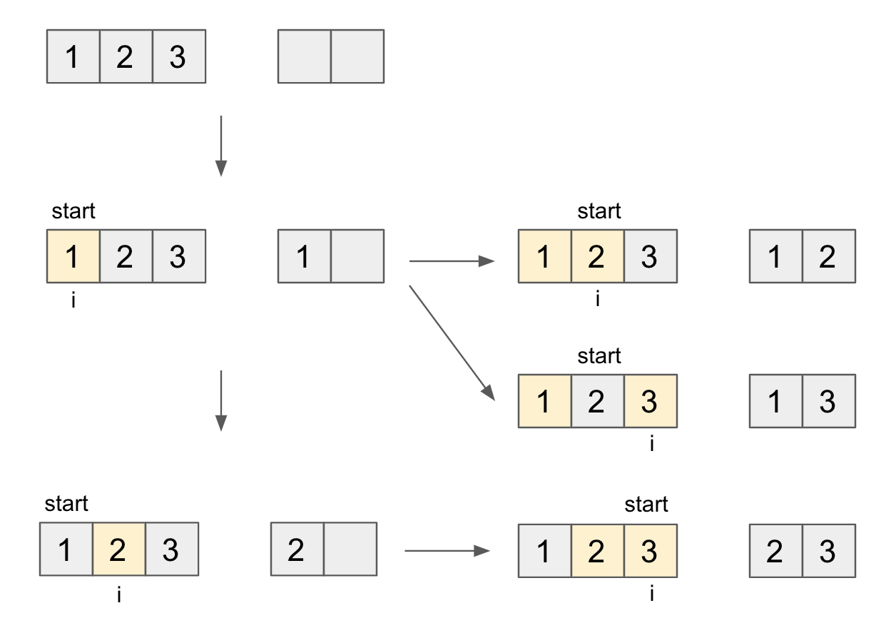 조합의 경우 순서가 없기 때문에 전체 인덱스를 돌면서 한 인덱스(i)를 선택하는 경우 다음 위치에는 뽑은 인덱스의 다음(i+1)부터 확인하면 됩니다. 이를 구현하기 위해 visited[] 배열과 start 변수를 사용하였습니다. 과정을 그림으로 간략히 살펴보면 다음과 같습니다.