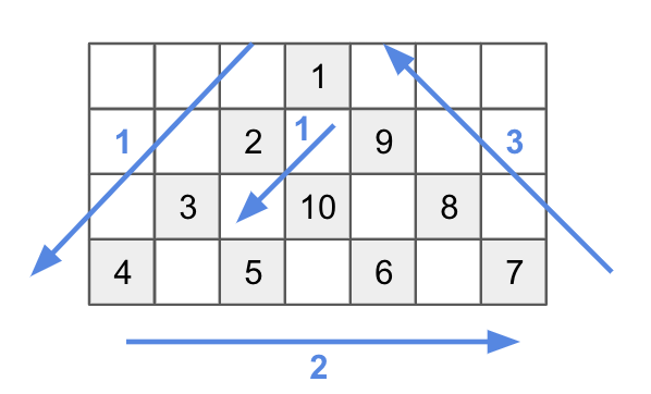 문제는 위와 같으며, 이 문제는 이차원 배열에 직접 숫자들을 위치에 맞게 저장한 뒤 최종적으로 이차원 배열에 저장된 수들 중 0이 아닌 수를 순서대로 저장하여 반환하는 방식으로 문제를 해결하였습니다.