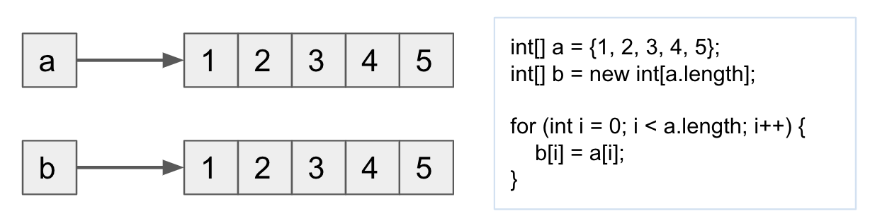 따라서 이차원 배열을 깊은 복사할 때는 이중 for 문을 사용하여 일일이 값을 복사해주거나 for 문을 돌면서 System.arraycopy(); 를 통해 이차원 배열을 복사할 수 있습니다.