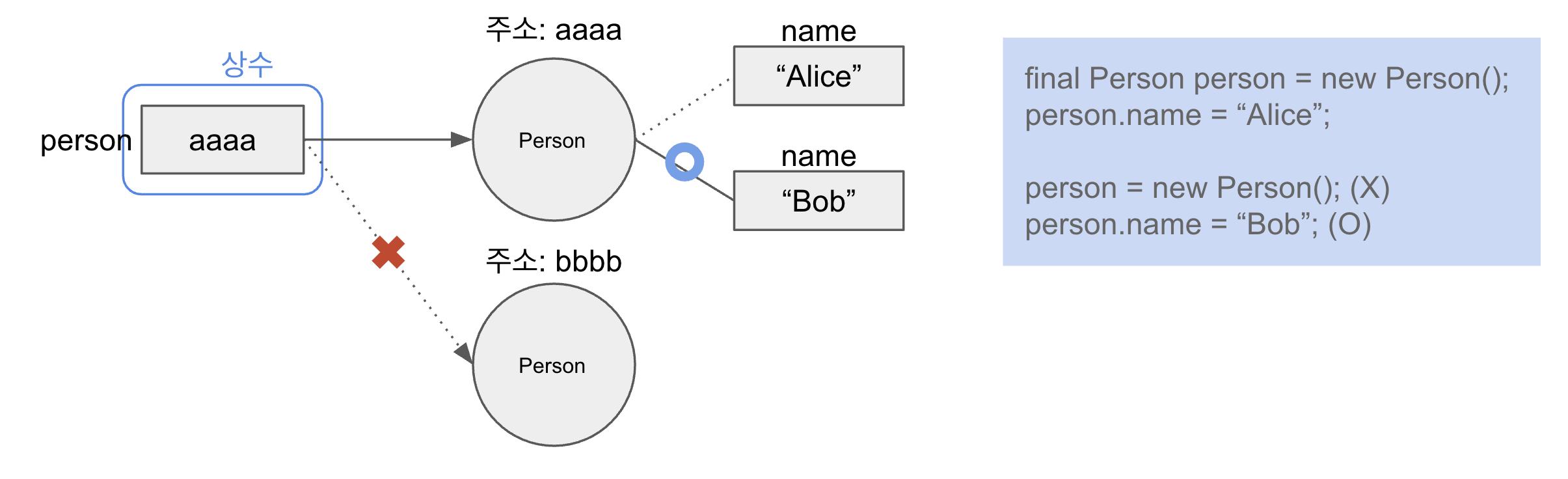 리터럴은 상수(Contant)와 많이 비교가 됩니다. 상수는 변하지 않는 변수를 의미합니다. 상수에 넣을 수 있는 값은 기본 데이터 타입뿐만 아니라 클래스나 구조체도 넣을 수 있습니다. 상수는 변수 선언 시 final 키워드를 붙여 정의합니다. 예를 들어, final int a = 3; 이 있다면 final 키워드를 붙인 a 가 상수입니다. 변하지 않는 변수인 상수에 클래스나 구조체도 넣을 수 있다고 하였는데 상수로 선언된 클래스 자체(클래스의 주소값)를 변경하는 것은 불가능하지만 클래스 내부의 데이터를 변경하는 것은 가능합니다.