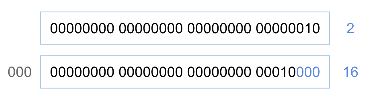 예를 들어, 2 << 3 의 경우 16 이라는 결과가 나옵니다.