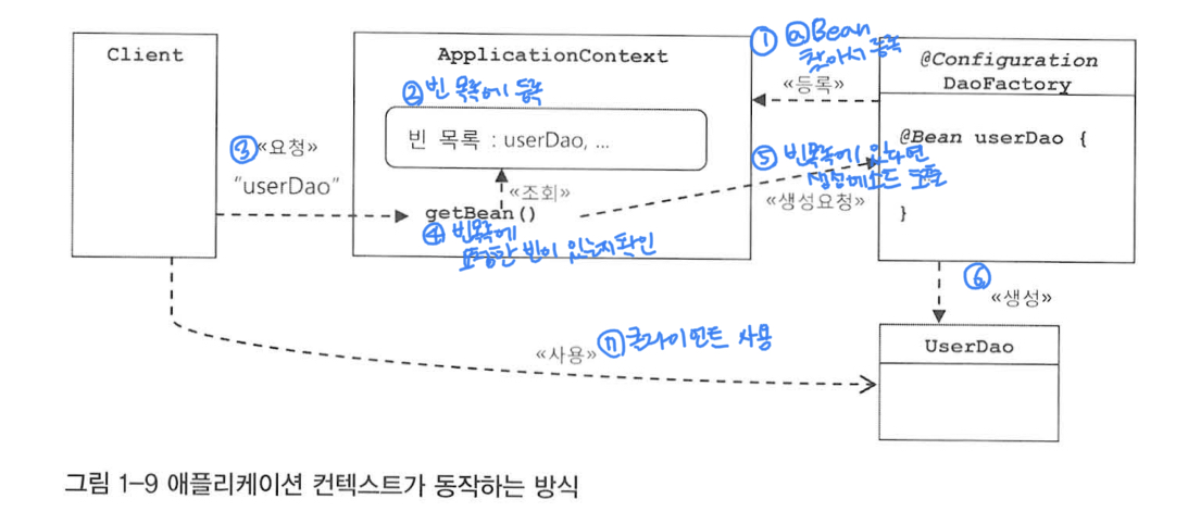 // 애플리케이션 컨텍스트가 관리하는 오브젝트를 getBean 메소드로 요청 (메소드명, 클래스 타입)
