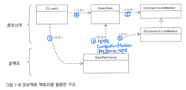 // DaoFactory 클래스를 통해 ConnectionMaker 구현체를 선택하여 생성된 UserDao를 전달 받아서 사용