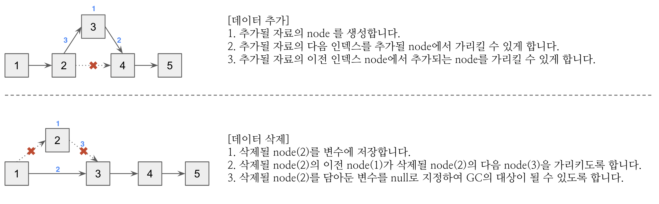 LinkedList에 데이터를 추가하고 삭제하는 방법을 그림으로 살펴보겠습니다.