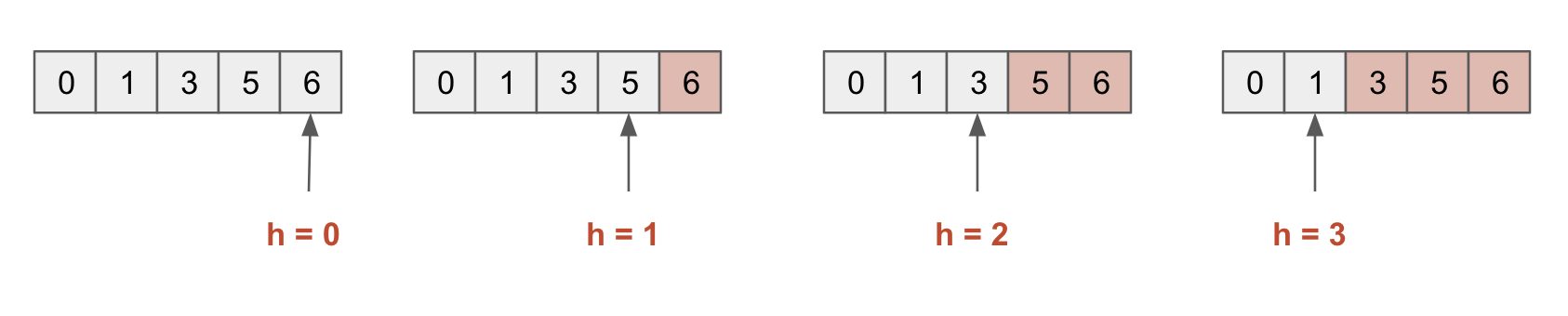 예를 살펴보면 다음과 같습니다. 주어진 논문이 [3, 0, 6, 1, 5] 이라고 하면 먼저 정렬을 한 뒤 아래 그림과 같은 과정을 거칩니다.