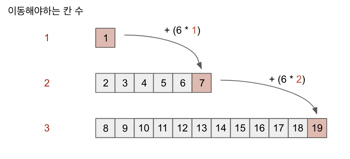 끝수는 이전 단계에서 6*(이동할 칸 수 - 1)입니다.