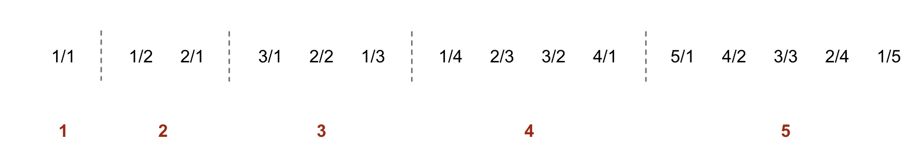 이 문제는 분수 모음의 개수가 등차수열을 이루며 (분모 + 분자)가 같은 분수들이 차례로 순서를 가집니다.