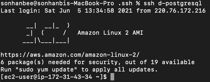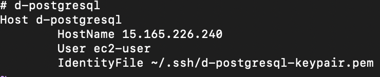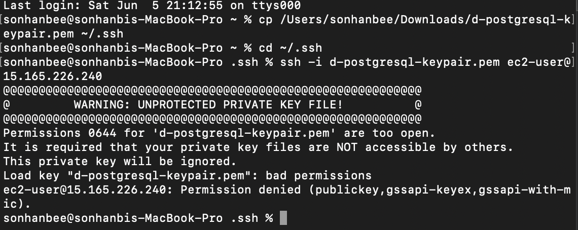 먼저 다운받은 pem 파일을 ~/.ssh 로 이동시킵니다. 저는 파일을 복사하는 방법을 사용하였습니다. 그런 다음 ~/.ssh 로 이동하고 먼저 pem 파일을 사용할 수 있는 권한을 줍니다. chmod 400 d-postgresql-keypair.pem