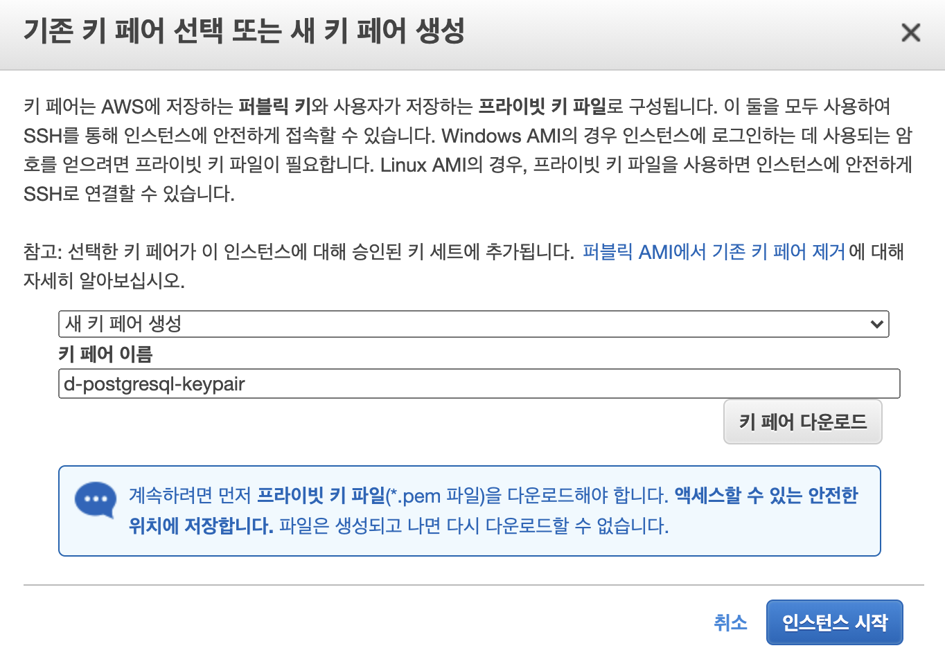 8. 검토 후 인스턴스 생성을 하는데 이때 ssh 접속에 사용할 키페어를 생성합니다. 기존에 생성한 키페어를 사용하여도 무방합니다. 이때 키페어를 다운받아 잘 저장해둡니다. (ssh 접속 시 사용할 예정)