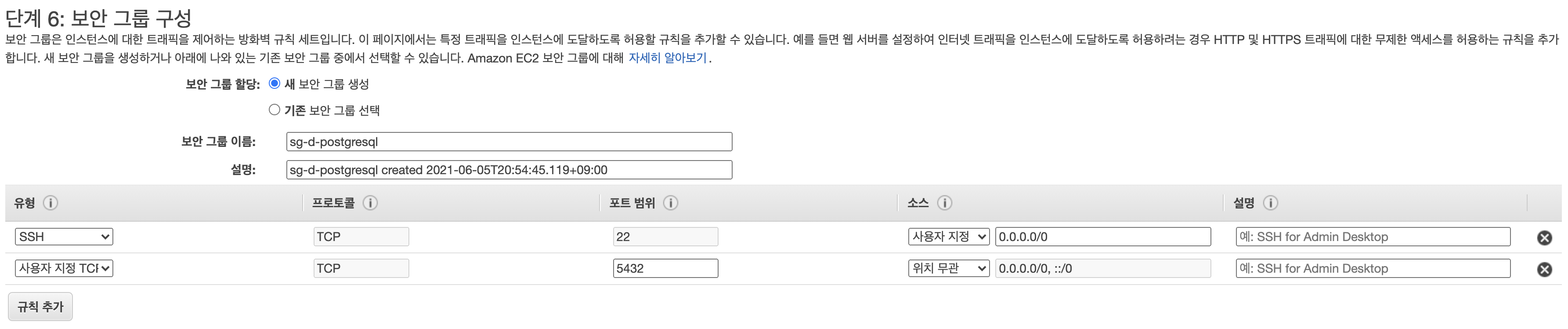 7. postgreSQL을 설치하여 접속할 것이기 때문에 postgreSQL이 사용하는 5432 포트를 추가해줍니다. 이때 특정 ip를 지정하는 것이 가장 좋지만 우선 테스트용이기 때문에 모든 ip가 접속할 수 있도록 하였습니다. 보안그룹 이름도 알맞게 바꿔줍니다.