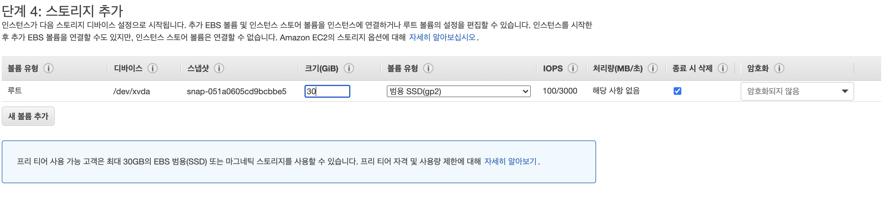 5. 스토리지는 프리티어 버전에서 30GB까지 쓸 수 있기 때문에 30GB로 변경합니다.