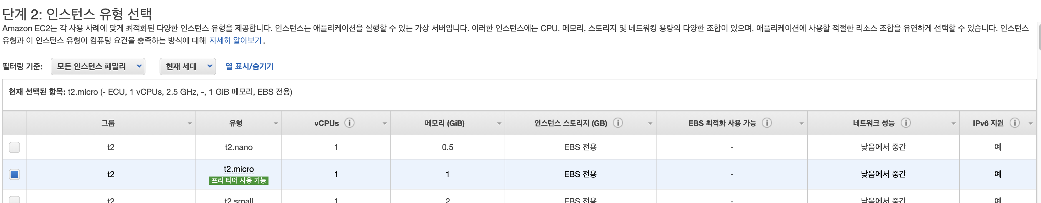 3. 인스턴스 유형도 프리티어 버전에서 사용할 수 있는 t2.micro를 선택합니다.