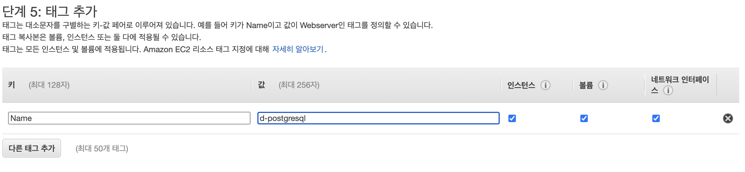 9. 인스턴스를 생성하고 나면 ec2 인스턴스 목록에서 방금 만들어진 d-postgresql 인스턴스를 확인할 수 있습니다.