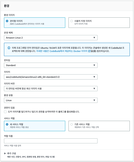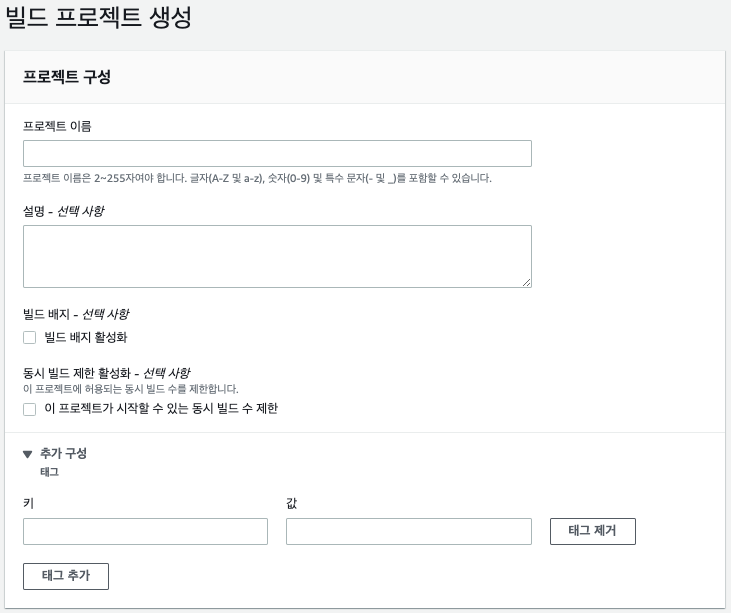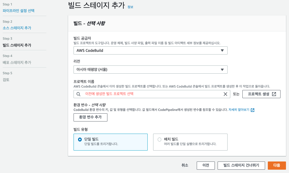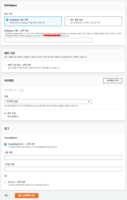 Code Build에서 빌드 프로젝트를 생성합니다. 빌드 관련 내용은 추후 프로젝트 내 buildspec.yml 파일에 작성할 예정입니다.
