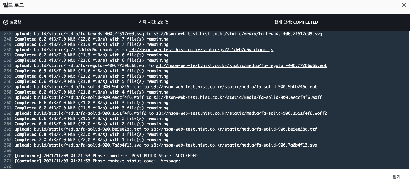 - aws s3 sync ./build s3://hson-web-test.hist.co.kr