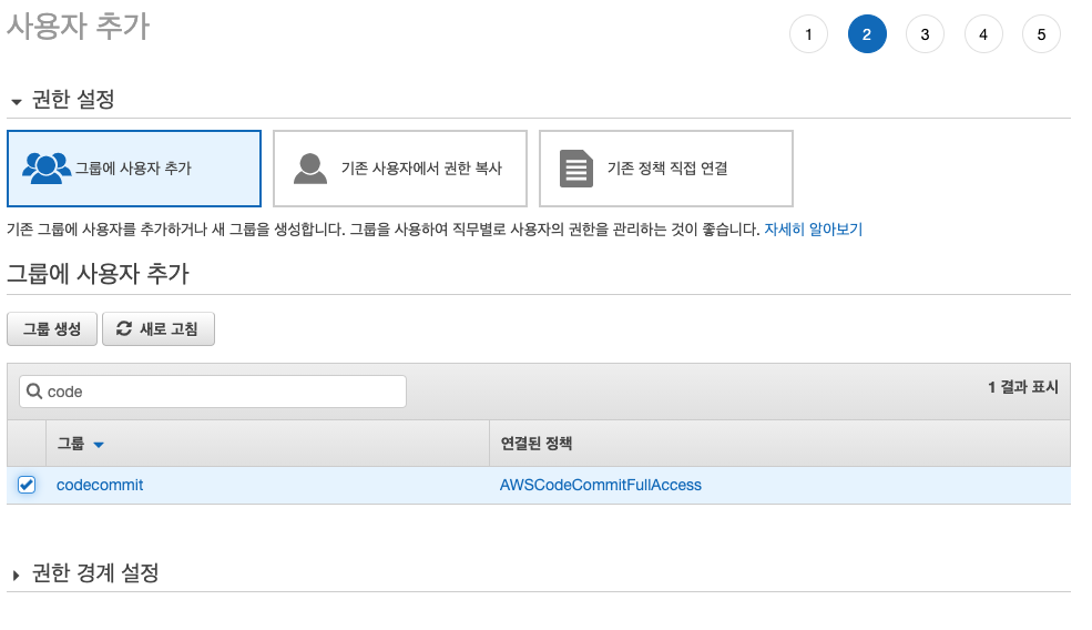 그룹이 없는 경우에는 직접 정책을 찾아서 연결합니다.