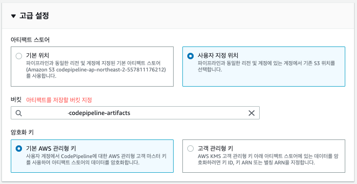 빌드에 사용되는 소스와 빌드 후 결과 아티팩트를 저장할 별도의 S3 버킷을 생성한 경우, 고급 설정을 눌러 아래와 같이 미리 생성한 버킷을 찾아 지정해줍니다.