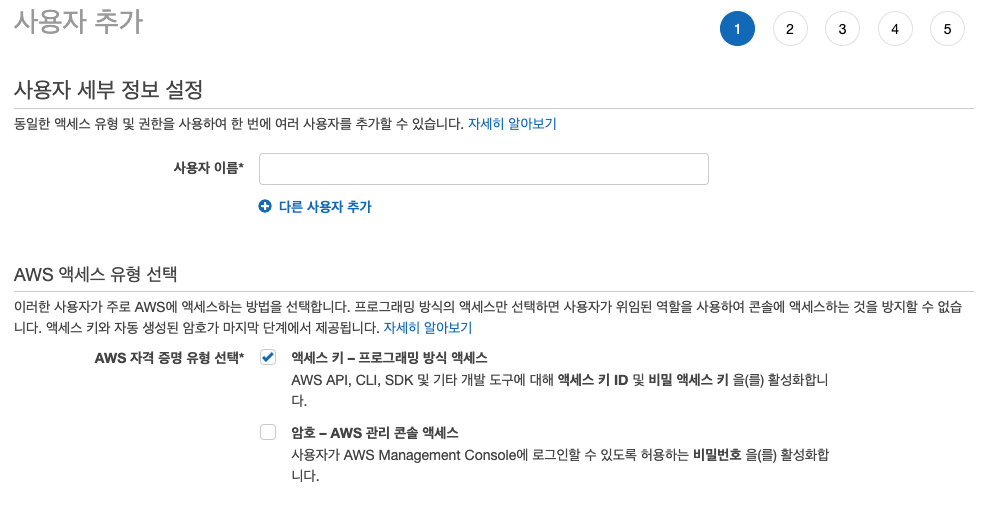 AWS IAM에서 사용자를 생성합니다. 로컬에서 Repository에 접속해 pull, push 등을 사용할 사용자는 AWS Management Console에 접속할 필요가 없기 때문에 AWS 액세스 유형을 "프로그래밍 방식 액세스"만 선택해도 됩니다.
