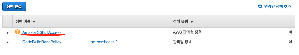 "AWS IAM > 역할"로 접속하여 Code Build에서 생성한 role을 찾아 S3 접근 권한을 추가합니다.