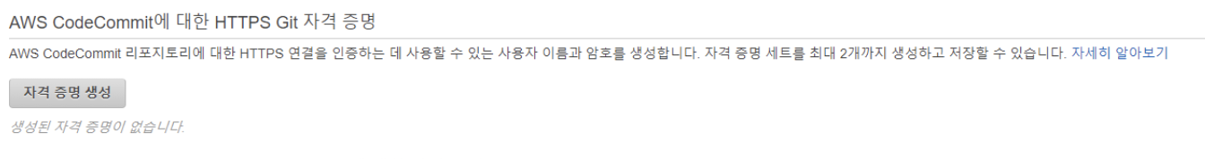 위에서 생성한 사용자의 정보에서 AWS CodeCommit에 대한 HTTPS Git 자격 증명 생성을 클릭하여 csv 파일(사용자이름, 패스워드 포함)을 다운받습니다.