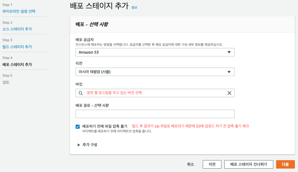 이번 테스트에서는 buildspec.yml 파일 안에서 빌드 후 S3로 build 디렉토리의 내용을 모두 옮기는 방식을 사용할 것이기 때문에 배포 스테이지는 건너뛰기 하겠습니다. 하지만 buildspec.yml 파일이 아닌 자동으로 배포를 구현하고 싶은 경우 아래와 같이 배포 스테이지를 추가하면 됩니다.