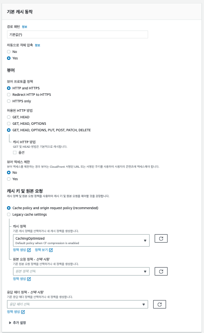 원본 도메인으로 기존에 정적 웹 사이트 호스팅을 하던 S3를 선택합니다. S3 버킷 액세스를 CloudFront에서만 할 수 있도록 선택하고 OAI를 생성하거나 기존 OAI를 선택합니다. 또한, CloudFront가 만들어질 때 버킷 정책을 수정할 수 있도록 버킷 정책 업데이트를 선택합니다. 나머지 설정은 각자 상황에 맞게 진행합니다.