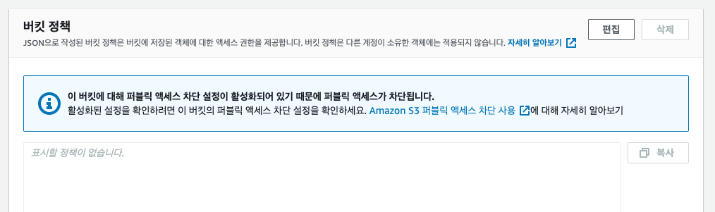 마지막으로 기존에 버킷의 객체들을 읽을 수 있도록 설정했던 버킷 정책도 모두 제거합니다.