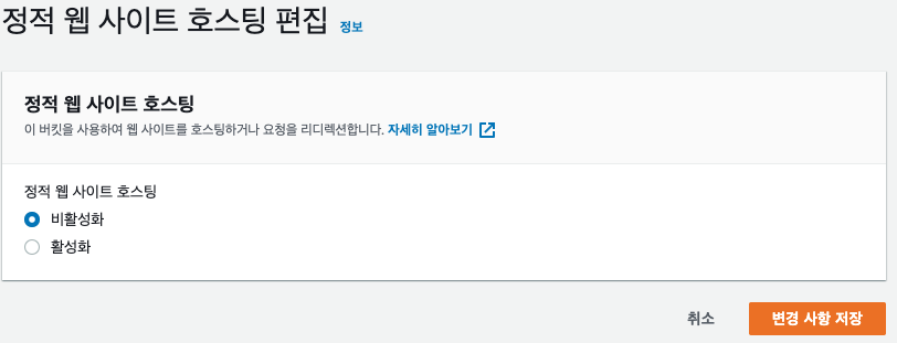 먼저 기존에 S3에서 정적 웹 사이트 호스팅을 활성화했었는데 이 부분을 비활성화 합니다.