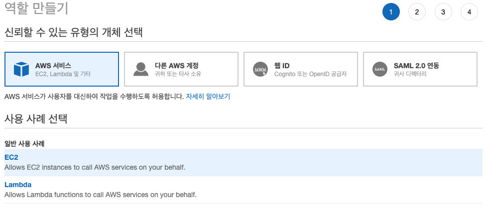 "IAM > 역할 > 역할 만들기"를 클릭하여 아래와 같이 EC2 역할을 생성합니다.
