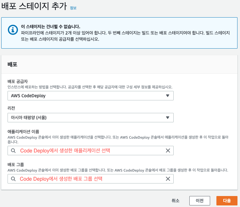 이제 CodeCommit으로 수정된 소스가 push 되는 경우, CodePipeline을 통해 자동으로 CodeDeploy가 동작하도록 설정해보겠습니다.