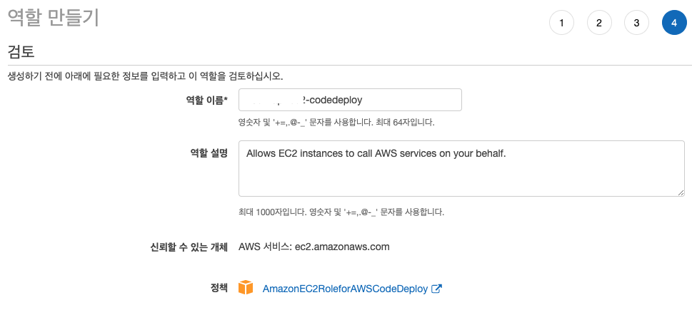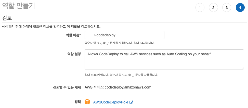 CodeDeploy에서 사용할 역할을 생성합니다. CodeDeploy 서비스를 선택하면 정책이 하나밖에 나오지 않습니다. 해당 정책을 선택하고 새로운 역할을 생성합니다.