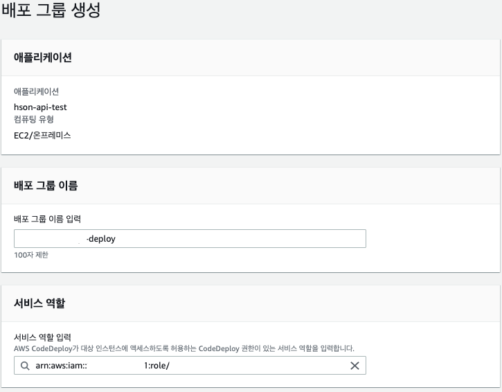 위에서 생성한 애플리케이션 내에 배포 그룹을 생성합니다. 서비스 역할 선택 시 위(5번)에서 생성한 CodeDeploy가 사용할 역할로 생성한 서비스 역할을 지정해줍니다.