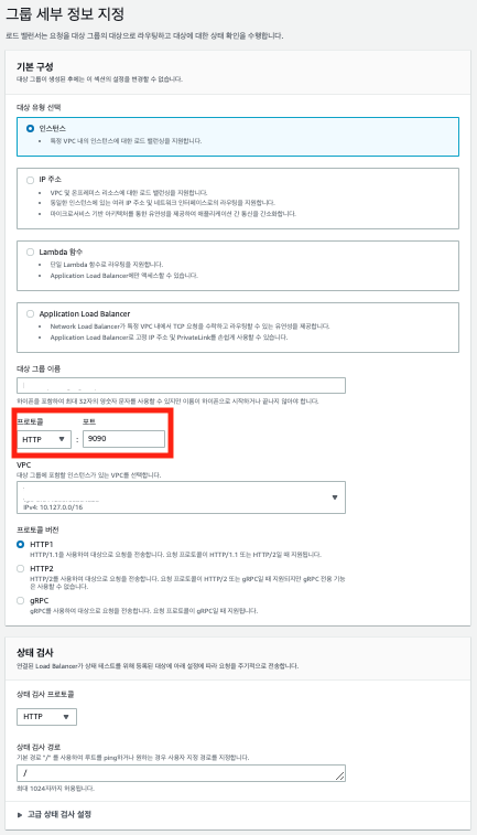 이후 대상 그룹 이름을 작성하고 프로토콜과 포트를 지정합니다. 현재 백엔드 서버는 9090 포트에서 운영되고 있기 때문에 HTTP 요청 포트를 9090으로 지정합니다. 그리고 두 EC2들이 있는 VPC를 선택합니다.