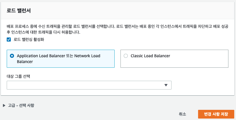다음으로 하단 로드 밸런서를 활성화 시키고 두 EC2를 포함하고 있는 대상 그룹을 선택합니다. 로드 밸런서를 활성화하면 배포가 진행되는 동안 트래픽을 차단했다가 배포 후 트래픽을 허용하도록 할 수 있습니다.
