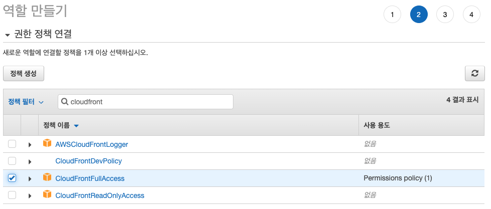 람다 함수를 사용하기 전 먼저 람다 역할을 생성합니다. 이번 람다에서는 CloudFront에 접근할 것이기 때문에 관련 정책을 추가합니다. 또한, 로그 정보를 CloudWatch에 저장할 것이기 때문에 관련 정책을 추가하고 람다 함수 종료 후 CodePipeline으로 결과를 전송할 것이기 때문에 관련 정책을 추가합니다.