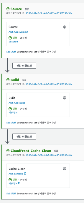 이전 글에서 Front-end 소스를 수정하고 CodeCommit Repository로 push하는 경우 CodePipeline을 통해 자동으로 빌드한 뒤, S3에 빌드된 소스를 저장하였습니다. 하지만 CloudFront에 캐시가 남아있어서 바로 적용되지 못해 AWS Management Console에서 CloudFront로 들어가 직접 무효화를 해줘야 하는 번거로움이 있었습니다.