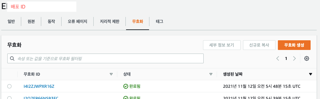 CloudFront에 접속하여 해당 배포를 찾아 무효화를 확인하면 새로운 무효화가 자동으로 생성된 것을 확인할 수 있습니다.