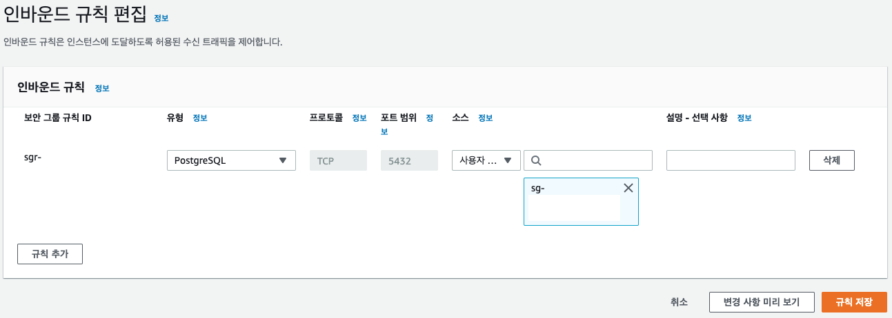위에서 새로 EC2를 생성하면서 새로운 보안 그룹을 적용했기 때문에 RDS로 접속할 수 있는 보안 그룹을 수정해주어야 합니다. RDS의 보안 그룹으로 들어가 인바운드 규칙을 수정합니다.
