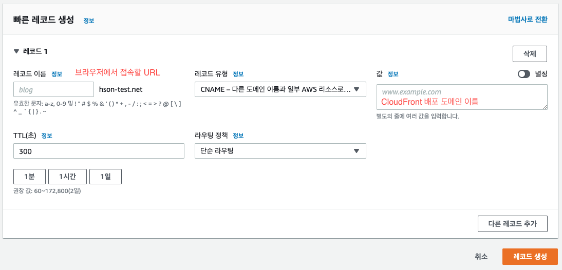 여기서 새로운 레코드를 생성하는데 웹 서비스를 위해 사용할 URL을 레코드 이름으로 지정하고 유형은 CNAME, 값은 CloudFront의 배포 도메인 이름을 지정합니다.