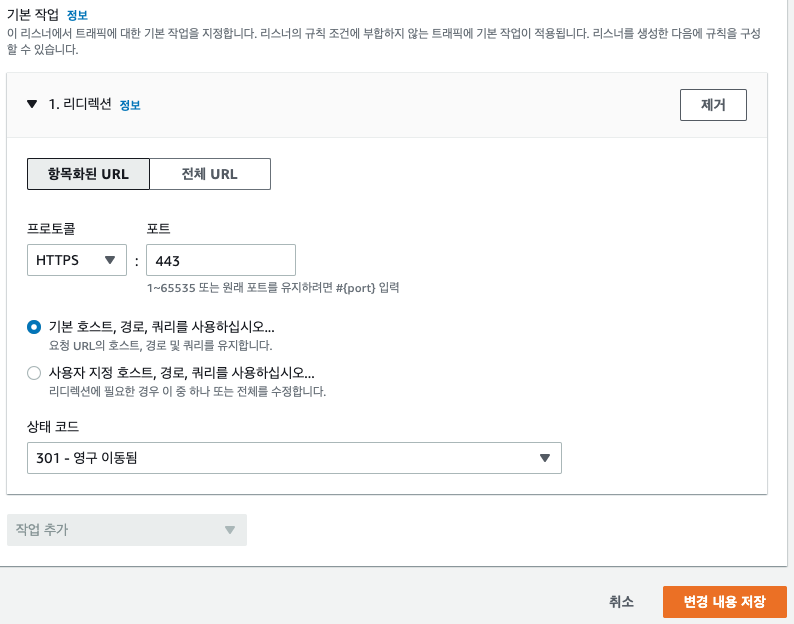 ❗️만약 CloudFront 없이 브라우저에서 바로 ALB로 요청을 보내는 경우 ALB에서도 HTTP 요청을 HTTPS로 리다이렉트 할 수 있습니다. 방법은 다음과 같습니다.