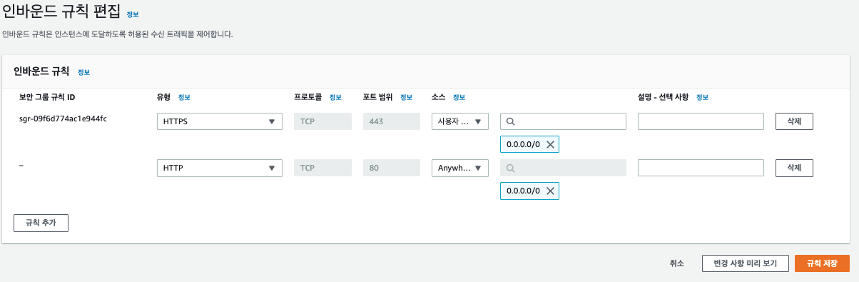 만약 ALB 보안 그룹이 HTTP 80 인바운드 규칙을 허용하지 않았다면 해당 규칙을 추가해줍니다.