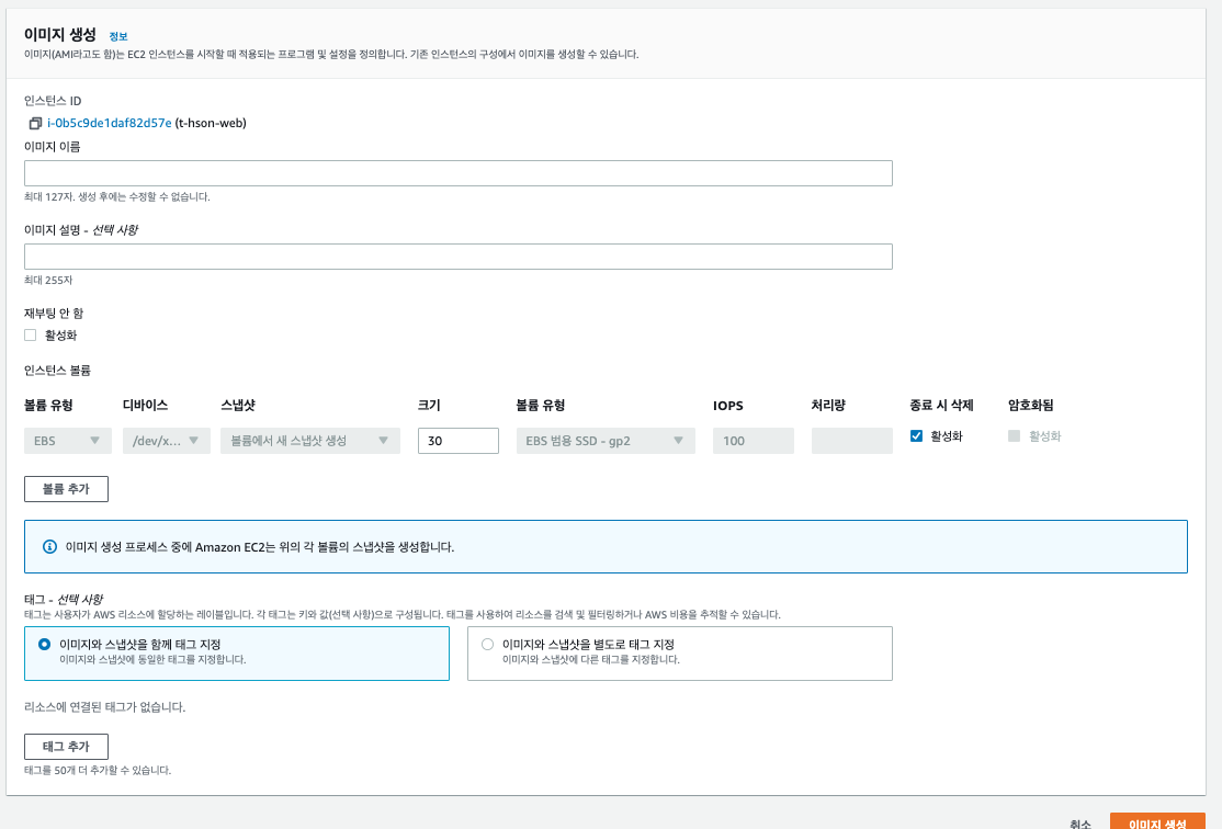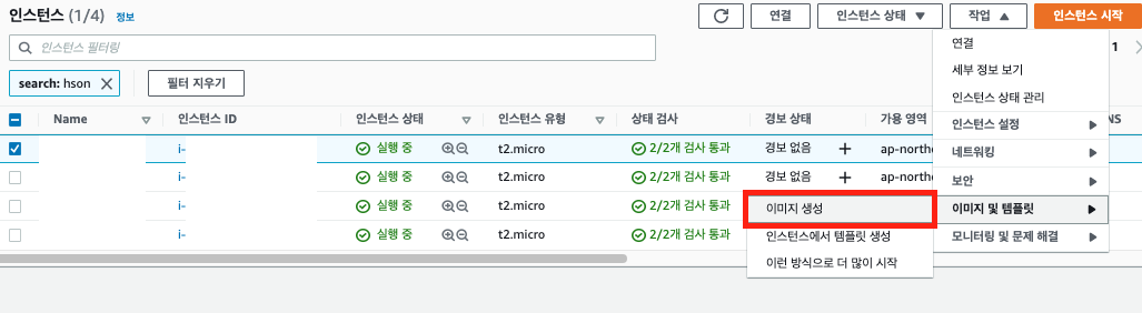 먼저 원하는 EC2를 선택하고 이미지를 생성합니다.