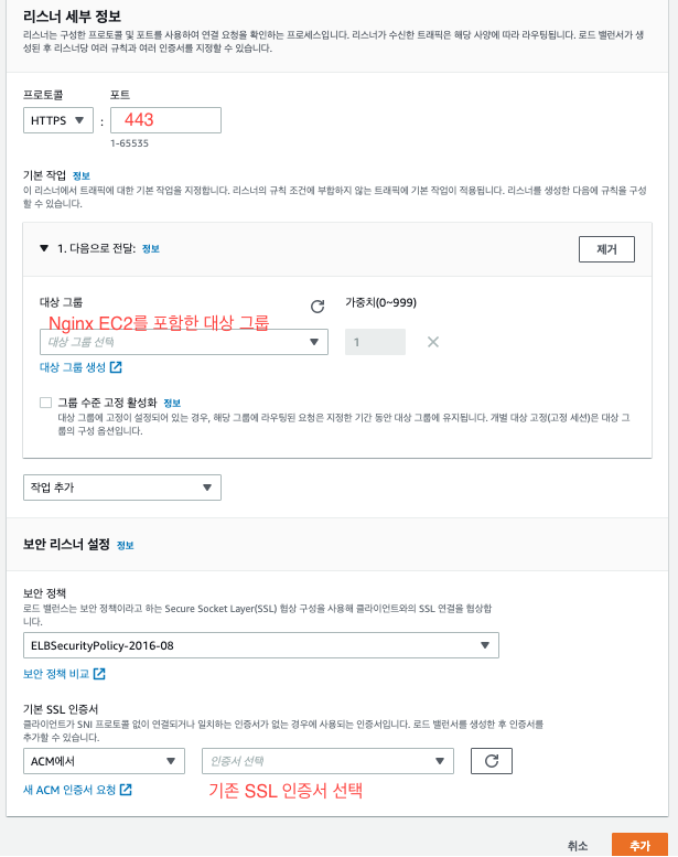 마지막으로 리스너는 HTTP 80으로 설정하고 대상 그룹은 기존 Node를 실행하는 EC2를 포함한 대상 그룹으로 선택합니다.