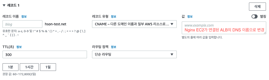 HTTPS 접속을 위해 인증서를 생성한 도메인으로 이동하여 레코드를 수정해야 합니다. 기존 CloudFront로 이동하던 레코드를 찾아 레코드 편집을 진행합니다. 만약 레코드가 없었다면 새로 생성하면 됩니다. 중요한 것은 값을 Nginx EC2가 연결된 ALB의 DNS 이름으로 설정해야 한다는 것입니다.