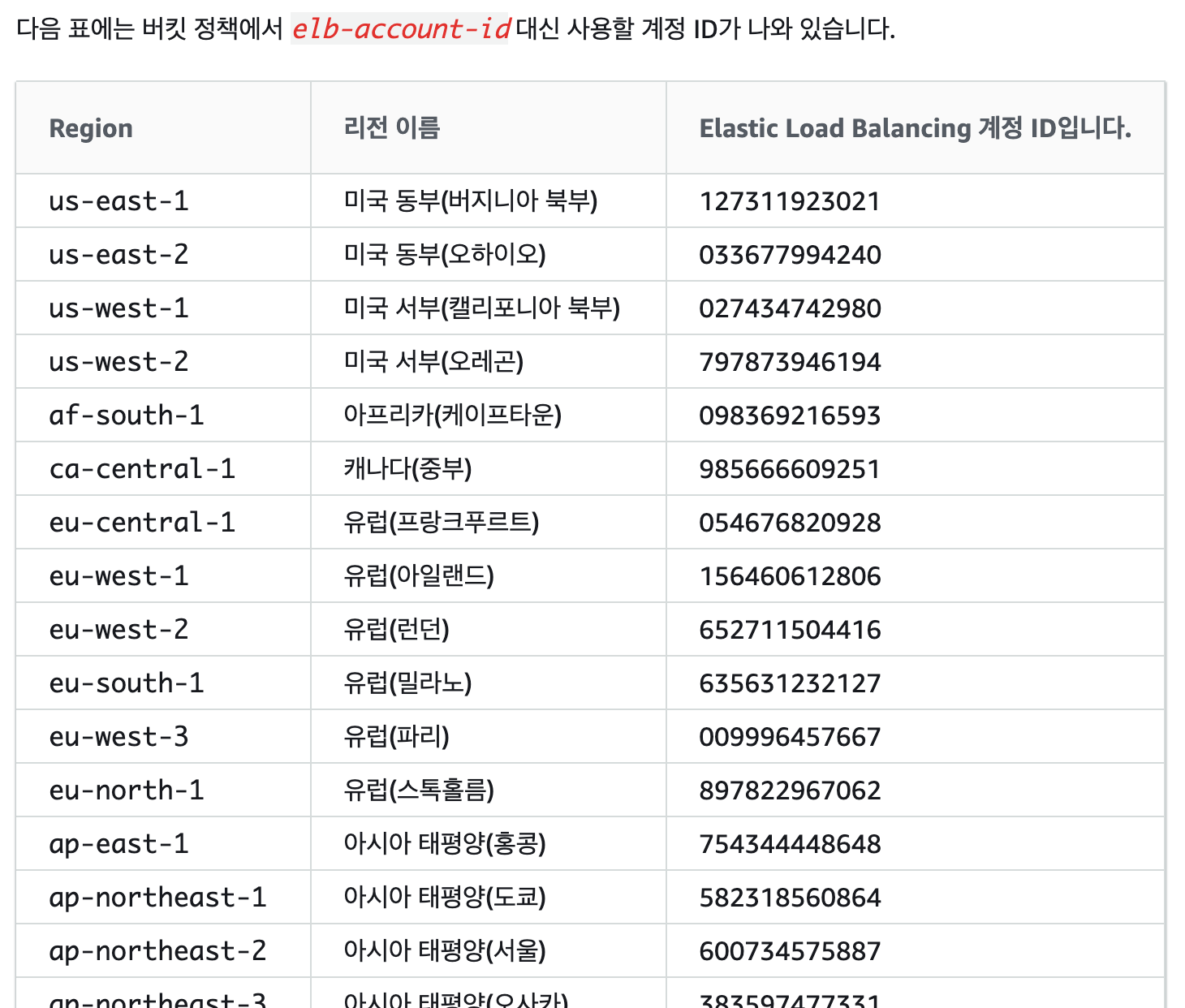 ELB_ACCOUNT_ID의 경우 공식 사이트에 리전별로 자세히 나와있으니 참고하면 됩니다.