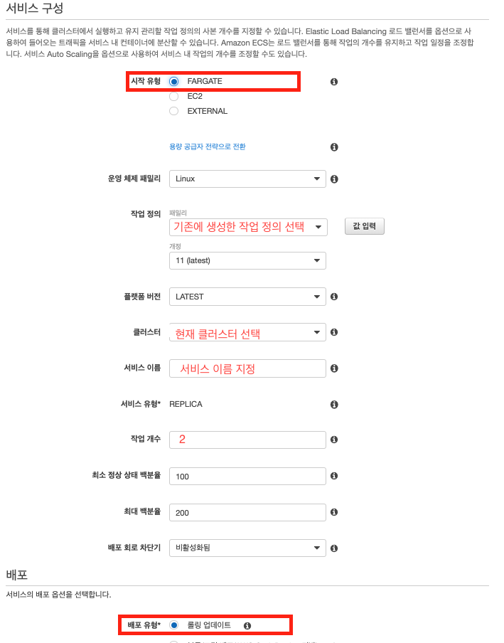 이제 위에서 생성했던 클러스터를 선택하고 서비스를 생성합니다. 서비스는 각 task들의 life-cycle을 관리합니다.